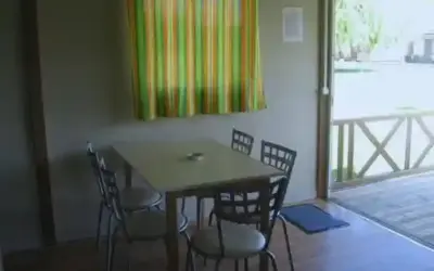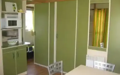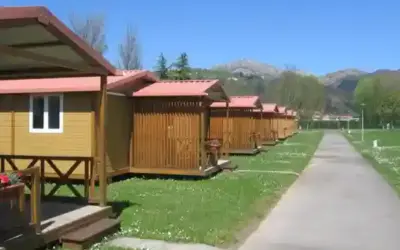 Los bungalows del Camping Sella son de madera y presentan una decoración sencilla en tonos verdes. Todos ellos disponen de zona de estar con TV de pantalla plana y zona de cocina.